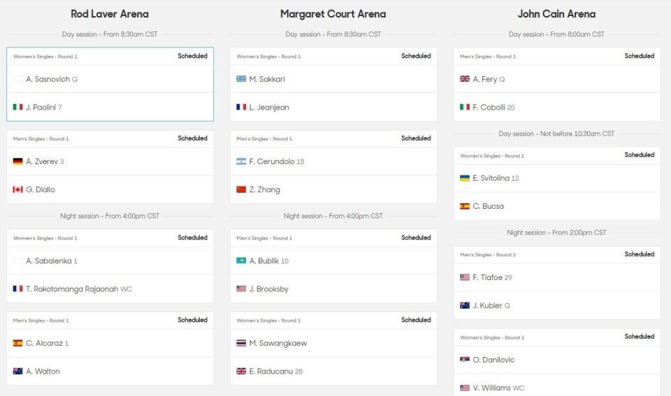 其他球场首日也有多场值得关注的对决。持外卡参赛的大威廉姆斯将对阵达尼洛维奇,大威将在本场比赛创造最年长澳网出场球员纪录。从资格赛突围、重回大满贯正赛的中国球员白卓璇,将面对前法网亚军帕夫柳琴科娃。