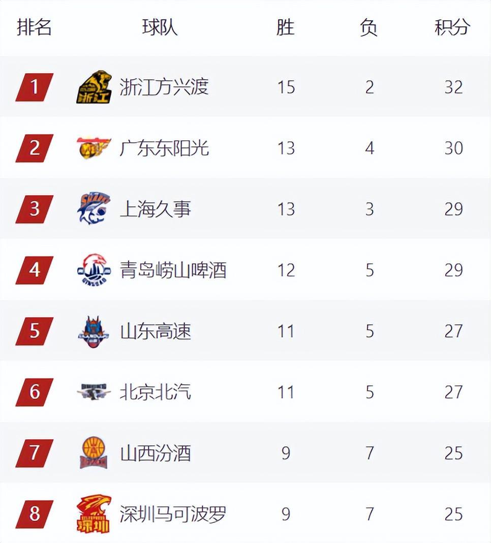 广厦豪取6连胜继续高居榜首,广东暂时来到第二,广厦和身后的广东已经完全拉开了差距,目前广厦阵容齐整,不出意外的话,他们会是第一阶段的榜首球队。山东击败吉林后,暂时来到第5,青岛战略性放弃比赛,让广东队重新坐稳了前三位置,青岛目前还是第4,看情况,青岛是将目标留在了未来和宁波广州的两场比赛,上海本轮将迎战北京,这将是一场重头戏,但相比之下,北京这次输球的可能性很大,毕竟球队现在也是伤兵满营,真不好打。